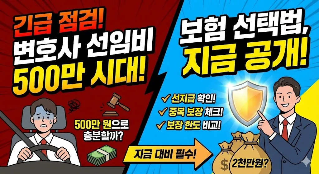 운전자보험 변호사선임비용 500만 시대에 대해 알아보겠습니다. 최근 변호사선임비용 보장 한도가 500만원으로 낮아지는 상품들이 늘어나면서 어떤 보험을 선택해야 할지 고민하는 분들이 많습니다. 이 글에서는 변호사선임비용 500만 시대에 맞는 현명한 보험 선택법, 부족한 보장을 보완하는 방법, 가입 시 반드시 확인해야 할 사항 등을 상세히 정리했습니다.